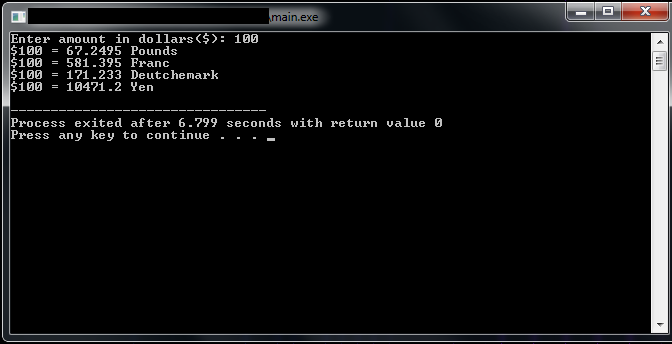 cout << "$" << dollar << " = " << dollar/0.584 << " Deutchemark" << endl;